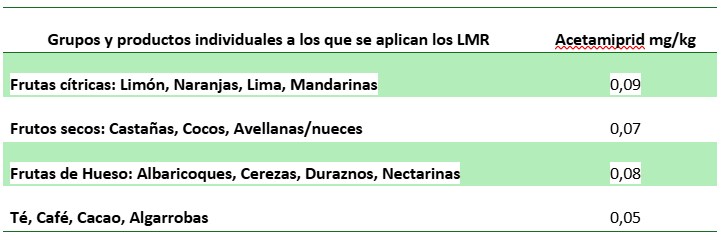 Veamos los LMR establecidos para la sustancia activa acetamiprid en algunos alimentos conocidos: