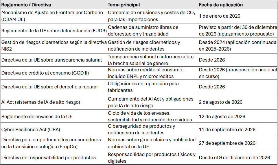 En este artículo repasamos de forma clara y práctica las principales regulaciones de la UE que se aplicarán en 2026. El objetivo es entender qué cambia, por qué es relevante y en qué momento conviene estar preparados para cumplir sin sorpresas.